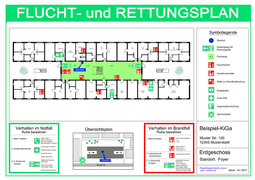 Der Flucht- und Rettungswegeplan ist übersichtlich und lagerichtig auszuhängen. Er stellt den Grundriss eines Gebäudegeschosses mit seinen Fluchtwegen und den Erste-Hilfe- und Brandschutzeinrichtungen dar um eine schnelle Orientierung des Betrachters zu gewährleisten. Weiterhin enthält er klare Verhaltensanweisungen für den Ernstfall.
